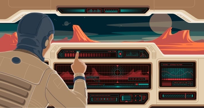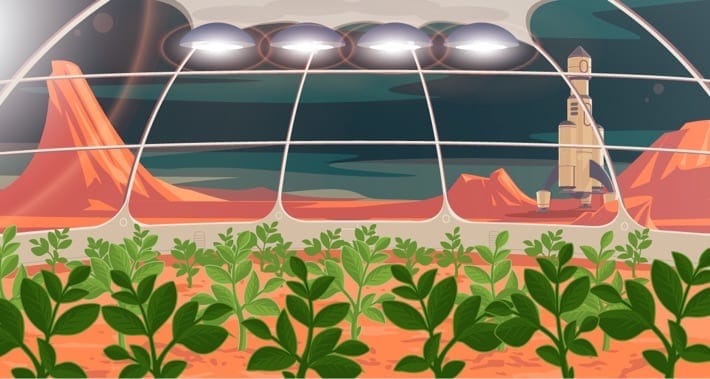 Illustration of man on mars for software company working with a project in Peru to develop technology to grow food on the red planet.